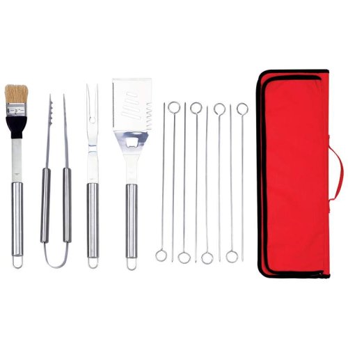 - Includes fork, spatula, tongs, basting brush, 8 skewers, and storage case