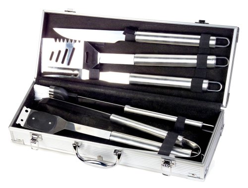 - 6-piece barbeque set includes a custom aluminum carrying case